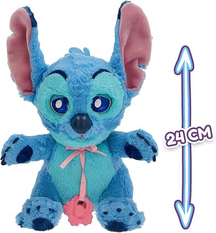 - Stitch è alto circa 24 cm e viene fornito con il suo ciuccio personalizzato e la borsetta-copertina